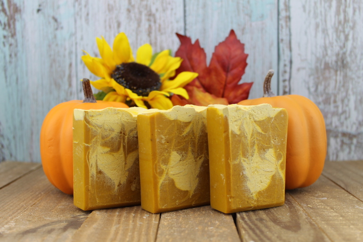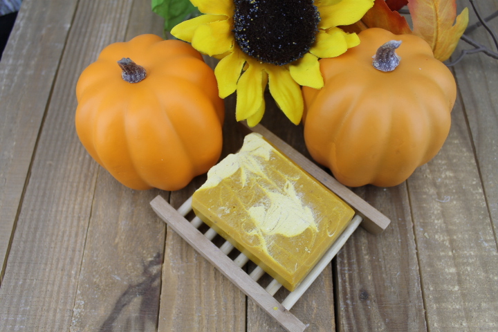 This bar not only fills your senses with the comforting aroma of fall, it is packed full of skin loving ingredients. The blend of oils and shea butter work harmoniously to produce a creamy lather that hydrates and nourishes dry, sensitive, and mature skin.  Pumpkin puree creates the soft orange color and provides gentle exfoliation.